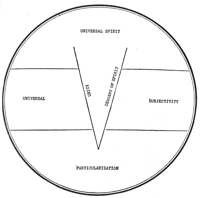 This chart shows, first, the Universal Spirit; then the Universal Soul or Subjectivity, which is the medium of all thought, power and action; then particularization or manifestation of Spirit.