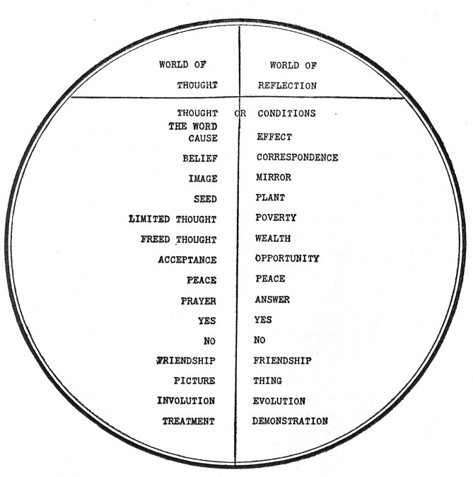 This chart is divided into two sides, representing the world of thought and the world of reflections. It represents the law of cause and effect. The world of thought is the world of ideas, while the world of reflections means the results of thought. The world of reflections is entirely a world of effects and is, of itself, unconscious and unknowing. Consider everything on the left side of this chart to be thoughts or ideas; and consider everything on the right side to be the automatic results of the law as it works out into effects. By using this chart in conjunction with the explanations already given, it will be plain just how the law of cause and effect works from the idea to the thing.