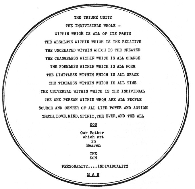 The big circle represents the Universal, within which is the individual; the One Person within Whom are all people. There is really but One Person in the Universe; but within this One Person all people live, "for in Him we live, and move, and have our being." 86 It is the Source and center of all Life, Power, Action, Truth, Love, Mind, Spirit, the Ever and the All. It is, of course, God.