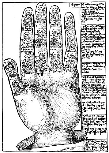Upon the twelve phalanges of the fingers, appear the likenesses of the Apostles, each bearing its own appropriate symbol. In the case of those who suffered martyrdom the symbol signifies the instrument of death. Thus, the symbol of St. Andrew is a cross; of St. Thomas, a javelin or a builder's square; of St. James the Less, a club; of St Philip, a cross; of St. Bartholomew, a large knife or scimitar; of St. Matthew, a sword or spear (sometimes a purse); of St. Simon, a club or saw; of St. Matthias, an axe; and of St. Judas, a halbert. The Apostles whose symbols do not elate to their martyrdom are St. Peter, who carries two crossed keys, one gold and one silver; St. James the Great, who bears a pilgrim's staff and an escalop shell; and St. John, who holds a cup from which the poison miraculously departed in the form of a serpent. (See Handbook of Christian Symbolism.) The figure of Christ upon the second phalange of the thumb does not follow the pagan system of assigning the first Person of the Creative Triad to this Position. God the Father should occupy the second Phalange, God the Son the first phalange, while to God the Holy Spirit is assigned the base of the thumb.--Also, according to the Philosophic arrangement, the Virgin should occupy the base of the thumb, which is sacred to the moon.