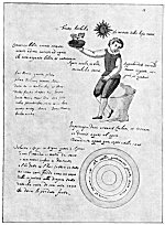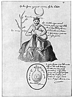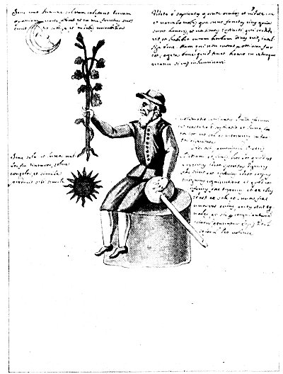 Leaf 8. Under the sun, moon, and Mercury are the words Three and One, an inference that the three are one. The words under the flower stems read: "Whiteness forty days after ashes." Under the blossoms is written: (left) "Minor time of the Stone"; (right) "The selected red." Between the arms of the central figure appears: "Let one pound of Mercury be placed." To the left is written: "If you who read shall have known this figure, you will possess the whole science of the Stone"; to the right: "And if you do not acknowledge it, you will be stiff-necked and dull." Above the sun is the word Father; above the satyr, "Ferment of the work." Beside the child is the sentence: "The son of the moon would threw the Stone into the fire--his mother." Above the flaming basket is written: "I am the true Stone." Under the central figure are the words: "A moderate fire is the master of the work."