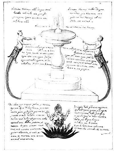 Leaf 11. The fount is described as that from which the two Mercuries of the Philosophers are extracted. At the upper left is described the white Mercury and at the right the red Mercury. The text about the fountain declares that Saturn collects the white Mercury, which is called the Water of Earth; and the Earth collects the red Mercury, which is called the Water of Heaven. The text to the left of the frog reads: "Through Him who created the Heavens and the Earth I am the Philosopher's Stone, and in my body I carry something the wise seek. If such a charm be extracted from me, it will be a sweet refreshment for you. I am an animal having father and mother, and father and mother were created; and in my body are contained the four elements, and I am before father and mother and I am a poisonous animal." The lines at the right describe distilling and calcining processes.