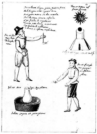 Leaf 17. The verse at the top of the page reads: "Not only must this material be fixed, but it must be allowed to enter into everything so that this material may be well completed and have infinite virtue. Then by making it thick, it becomes at once all white, sublimation from white it becomes shining." Above the sun are the words: "God and Nature do nothing in vain." The man on the left is a mediæval conception of Hermes, the great Egyptian philosopher; the one on the right is Christopher, the philosopher of Paris. Above the latter is written: "If the Stone is black, it is not useless." The words over the retort are: "There is air, fire, water, and earth." Below is added: "A dissolution of the body is the first step. " The curious chemical apparatus must be considered purely symbolic in this work and, as its author himself says, is intended to give only a hint of the "Art."