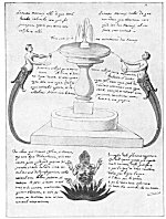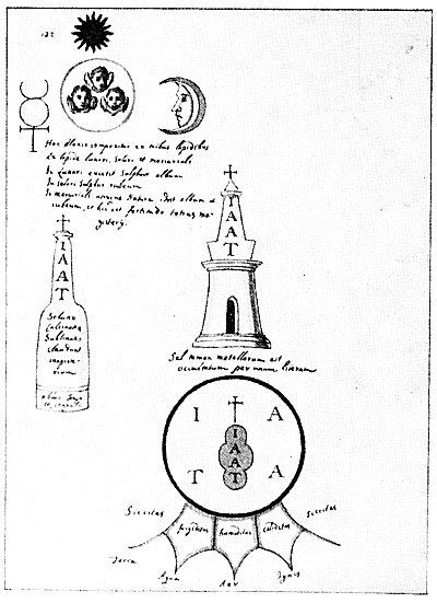 In addition to the 26 leaves here reproduced there are ten bottles or retorts, each half filled with varicolored substances. These bottles can be so easily described that it is unnecessary to reproduce them. The first bottle (from the mouth of which issues a golden shrub with three blossoms) contains a bluish-gray liquid, the entire figure being called "Our Quicksilver." Under the vessel is a verse containing the significant words: "He will have white garments for black and then red." The second bottle (from the neck of which rise four golden flowers) also contains the bluish-gray substance termed quicksilver. Below the bottle is the admonition to "make spirit of the body and grace of the gross, that the corporeal may become incorporeal."