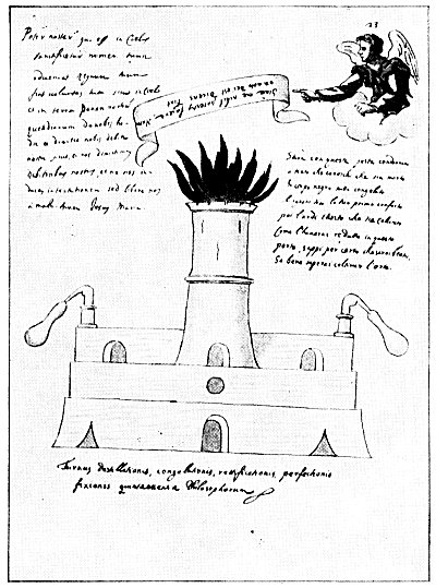 Leaf 23. The writing at the upper left is, in substance, the Lord's Prayer, with the addition of the words Jesus and Mary at the end. The inverted words in the banner read: "Ye can do nothing without me, for God has so promised, saying 'So be it.'" The text under the angel reads: "By this plague he will be damned who knows he is dead, all cold in a black body. And let this be thy first comfort: then he will burn unto calcination. When I have reduced him within this door, know for certain that I shall be blessed if I shall know how to cultivate the garden." The main part of the leaf is devoted to an elaborate symbolic drawing of alchemical equipment, under which are the words: "The furnace of distillation, congealing, rectification, perfection, fixation: quintessence of the Philosophers." By "quintessence" should be understood the "fifth essence" of the most wise.