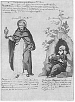 Leaf 2. At the top is a quotation from St. Thomas Aquinas concerning the composition of the Philosopher's Stone, which is described as of the purest transparency; in it all the forms of the elements and their contrarieties were visible. Beneath the figure of St. Thomas Aquinas is a short paragraph praising the excellence of the Philosophic Stone, declaring that from the one substance can be derived three and from the three, two. To the right of St. Thomas Aquinas is a likeness of Raymond Lully seated in the door of his hermitage. Under his feet appears a quotation from this celebrated alchemist, beginning with the question, "What is the Philosopher's Stone?" After declaring it to be a reddish, fixed mercury, Lully swears to the Almighty that he has told the truth and that it is not permissible to say more. (The original manuscript is mutilated at this point.)