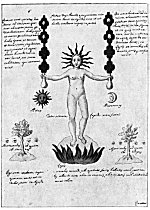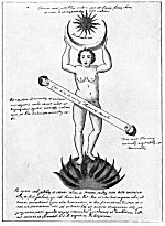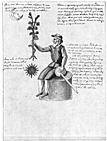 Leaf 18. At the left holding a book stands Aristotle, who is described as the most learned of all the Greeks. The tree surmounted by the Sun and Mon. is accompanied by the wards: "When the Stone is dead, that is changed to water, in this it will produce flowers." Beneath Aristotle and the prostrate human figure from which rises the flowering tree are these statements: "He who makes everything descend from heaven to earth, and then ascend from earth to heaven, has information about the Stone. For in Mercury there is something the wise seek, not invoked except by white or red ferment." The first part of this quotation is based upon the Emerald Tablet of Hermes (which see). In ordinary man, the spirit is figuratively absorbed by the body; but in the true philosopher, the spirit is so greatly increased in power that it absorbs into itself and is nourished by man's corporeal body.