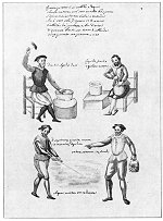 Leaf 7. The verse at the top reads:," This Stone is so noble and worthy that Nature has hidden it in her recesses. Its soul is all fair, and pure, for it is the true sun. I inform you of this. Keep it removed, apart and separated. Whatever boon you crave, it will come to you bounteously. without sin, with pleasure and delight." The seated figure on the left holding aloft the hammer is described as breaking hard stone, while the words beside the man with the retort read: "Breaking of stone our replenishment." Between the standing figures below is the exclamation; "O Sages, seek and ye shall find my Stone!" Under the outstretched hand of the man with a basket appear the words: "Draw out sorerem [?] in the bottom." Below the pool which the man on the left is stirring appears the simple statement: "Our healing water." The faces of the four men are extremely well drawn.