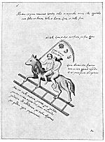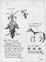 Leaf 12. The three words at the top read: "This is Nature." The lines above the donkey read: "This is the Philosophers' donkey who wished to rise to the practice of the Philosopher's Some." The three lines below the animal are translated: "Frogs gather in multitudes but science consists of clear water made from the Sun and Moon." The text under the symbolic bird is as follows: "This is fortune with two wings. Whosoever has it knows that fruit will in such away be produced. A great philosopher has shown that the stone is a certain white sun, to see which needs a telescope. To dissolve it in water requires the Sun and Moon, and here one must open 200 telescopes, putting body and soul in one mass. And here is lost the mass; other sages cook the frogs and add nothing, if the juice of the Wise you wish to enjoy." To the Greeks the frog symbolized both metempsychosis and earthly humidity.