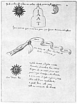 "Because of its drawings and illustrated expositions, the manuscript is of preeminent importance to the Rosicrucians and the contemporary order of Freemasons. The first, and larger, part of the illustrations deals with the Hermetic philosophy, explaining its teachings and doctrines. Interspersed among these are portraits of great teachers and satirical representations of bunglers and their mistaken views. The systematically arranged part shows with wonderful clearness the color development of the alchemical processes from blue-gold over black to white and rose. Throughout it treats of the change in human beings and not of the making of gold. Ever upon the Grade of Black (the return into Chaos from which new creations are possible) follows the Grade of the Neophytes, the New Birth, which is often repeated with impressive lucidity. The black stage occurs as usual through fire. This unopened and unpublished manuscript belongs to the order of the most important Precepts and Documents of the Rosicrucians, and Freemasons. A search through the museums and library collections of Germany has failed to reveal any item of even a similar character."