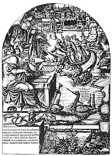 Jean Duvet of Langres (who was born in 1485 and presumably died sometime after 1561, the year in which his illustrations to the Apocalypse were printed in book form) was the oldest and greatest of French Renaissance engravers. Little is known concerning Duvet beyond the fact that he was the goldsmith to the King of France. His engravings for the Book of Revelation, executed after he had passed his seventieth year, were his masterpiece. (For further information regarding this obscure master, consult article by William M. Ivins, Jr., in The Arts, May, 1926.) The face of John is an actual portrait of Duvet. This plate, like many others cut by Duvet, is rich in philosophical symbolism.
