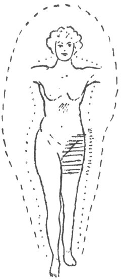 Her aura, when examined in 1912, was blue in colour. On the right side the outer aura had a normally defined edge, and was typically spatulate, being nine inches round the head and by the trunk, curving inwards just below the lowest level of the body, becoming four inches by the knee. On the left side the aura gradually shaded off to its margin, and as far as could be verified, was eight inches by the trunk, but on a superficial examination looked less, and bent inwards at a sharp angle just below the crest of the ilium, from whence it proceeded downwards at a width of three inches. Viewed sideways, the aura was four inches in front of the trunk, the right thigh and leg, but was one inch narrower by the left thigh and leg. At the back there was the usual large lumbar bulge seen with this type of aura, being eight inches wide at the broadest part; lower down along the thighs and legs the haze had the same width as in front. The inner aura was equal in breadth over the whole body, except from the crest of the ilium to the middle of the thigh on the left side. The aura looked quite natural above the affected part, over which there appeared a dark void space three quarters of an inch deep, resembling a wide etheric double. It was impossible to determine how far round the thigh this blank space extended. External to this void the aura was coarsely striated. The outer aura here was also correspondingly coarse, and the alteration of texture was limited by the vertical median lines of the body back and front. The c.c. band was dark between the crest of the ilium and the middle of the thigh on the left side. It also disclosed a dark patch on the epigastrium due to indigestion. Otherwise the band was uniform over the whole body.