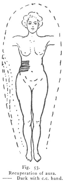 dark space one eighth of an inch in breadth. This showed that while the aura had regained its proper shape, it had not resumed its natural condition. With the blue c.c. band the quadrilateral space in the hypochondriac region still was darker than the rest of the band, but the difference was not so pronounced. The extension band on the right side also remained of a darker hue than on the left, but the difference was less marked. Fig. 53 shows the gradual amendment in the aura from time to time.