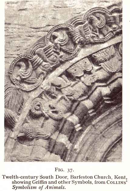 The phoenix and griffin we have encountered already in our excursions. The latter, we are told, inhabits desert places in India, where it can find nothing for its young to eat. It flies away to other regions to seek food, and is sufficiently strong to carry off an ox. Thus it symbolises the devil, who is ever anxious to carry away our souls to the deserts of hell. Fig. 37 illustrates an example of the use of this symbolic beast in church architecture.