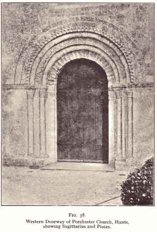 With bow and arrow in its hands the centaur forms the astrological sign Sagittarius (or the Archer). An interesting example of this sign occurring in church architecture is to be found on the western doorway of Portchester Church--a most beautiful piece of Norman architecture. "This sign of the Zodiac," writes the Rev. Canon VAUGHAN, M.A., a former Vicar of Portchester, "was the badge of King Stephen, and its presence on the west front [of Portchester Church] seems to indicate, what was often the case elsewhere, that the elaborate Norman carving was not carried out until after the completion of the building."[2] The facts, however, that this Sagittarius is accompanied on the other side of the doorway by a couple of fishes, which form the astrological sign Pisces (or the Fishes), and that these two signs are what are termed, in astrological phraseology, the "houses" of the planet Jupiter, the "Major Fortune," suggest that the architect responsible for the design, influenced by the astrological notions of his day, may have put the signs there in order to