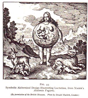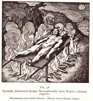 At least three varieties of opinion can be traced from the view of sex we have under consideration, as to the nature of the perfect man, and hence of the most adequate symbol for transmutation. According to one, and this appears to have been JACOB BOEHME'S view, the perfect man is conceived of as non-sexual, the male and female elements united in him having, as it were, neutralised each other. According to another, he is pictured as a hermaphroditic being, a concept we frequently come across in alchemical literature. It plays a prominent part in MAIER'S book Atalanta Fugiens, to which reference has already been made. MAIER'S hermaphrodite has two heads, one male, one female, but only one body, one pair of arms, and one pair of legs. The two sexual organs, which are placed side by side, are delineated in the illustrations with considerable care,