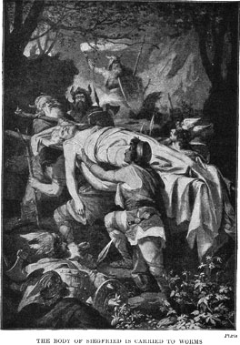 Siegfried stood before her, and she said, "Welcome, Sir Siegfried, welcome; we thank you one and all." He bent before her and she kissed him.