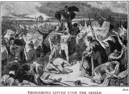 Aetius now began to fear that he would be beaten, but just at that moment Thorismond, the son of Theodoric, made another charge against the Huns. He had taken command of the Visigoths when his father was killed, and now he led them on to fight. They were all eager to have revenge for the death of their king, so they fought like lions and swept across the plain with great fury. The Huns were soon beaten on every side, and Attila himself fled to his camp. It was the first time he had ever been defeated. Thorismond, the conqueror, was lifted upon his shield on the battle-field and hailed as king of the Visigoths.