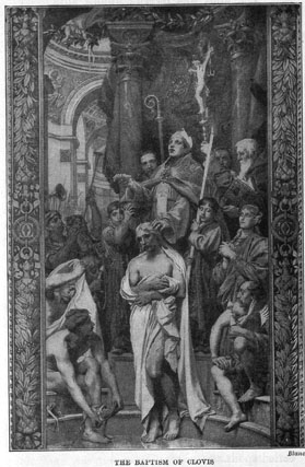 When Clovis returned home he did not forget his promise. He told Clotilde how he had prayed to her God for help and how his prayer had been heard, and he said he was now ready to become a Christian. Clotilde was very happy on hearing this, and she arranged that her husband should be baptized in the church of Rheims on the following Christmas day.
