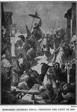 MOHAMMED thought that it was right to spread his religion by force, and to make war on "unbelievers", as he called all people who did not accept his teaching. He therefore got together an army and fought battles and unbelievers. He gained many victories. He marched against Mecca with an army of ten thousand men, and the city surrendered with little resistance. The people then joined his religion and destroyed their idols. Before very long all the inhabitants of Arabia and many of the people of the neighboring countries became Mohammedans.