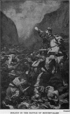 High cliffs walled in the pass on either side. From the tops of these cliffs the Basques hurled down rocks and trunks of trees upon the Franks, and crushed many of them to death. Besides this, the wild mountaineers descended into the pass and attacked them with weapons. Roland fought bravely; but at last he was overpowered, and he and all his men were killed.