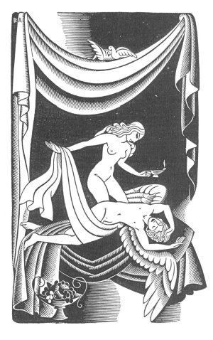 Her son was Cupid, that winged boy who goes through men's houses by night, armed with his bow and arrow, troubling their wedded lives. She left him there, gazing on the maiden Psyche. And gazing upon her, Cupid fell deeply in love with the maiden. He had no mind to carry out the command of his mother; he did not want to smite her mind with the madness of an unworthy love; rather he thought upon how he might win for himself the one who was fairer than any being upon earth or even in the heaven above.