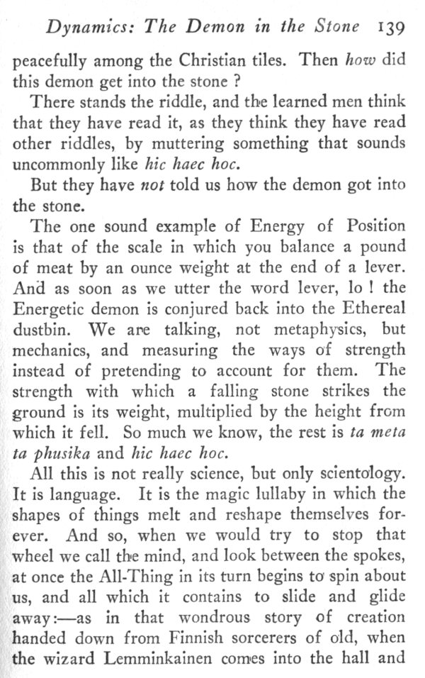 However that is just what science, speaking through the mouth of its priests, will not allow. According to them, when you throw the stone down there is some other power at work besides your push and the earth's pull; there is this mysterious Potential Energy which has been inside the stone all the time. It seems to be a scientific case of demon-possession. The demon of Latin Energy enters into some stones but not others. It prefers stones on the roof of a house if it can get them, but if not, it will take stones on mountains, just as the demons in the gospel, when they were cast out of the man, entered into the swine. It is remarkable that those demons behaved very much like Energetic ones, for they drove the swine violently down a steep place into the sea.