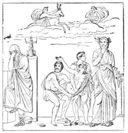 ![A HIND SUBSTITUTED FOR IPHIGENIA.<br> [Agamemnon, her father, veils his head, while Diomedes and Odysseus deliver the virgin over to Kalchas, the priest. Artemis appears in the clouds and a nymph brings the hind.--<i>After a Pompeian fresco</i>.]](tn/generic.jpg)