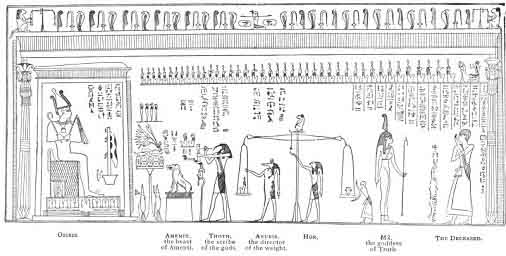 The dread of hunger, thirst, and other ills, or even of destruction which their double might suffer in the tomb, was a perpetual source of fearful anticipations to every pious Egyptian. The anxiety to escape the tortures of their future state led to the embalming of the dead and to the building of the pyramids. Yet, in spite of all superstitions and the ridiculous pomp bestowed upon the burial of the body we find passages in the inscriptions which give evidence that in the opinion of many thoughtful people the best and indeed the sole means of protection against the typhonic influences after death was a life of righteousness. This is forcibly expressed in the illustration of Chapter CXXV. of the Book of the Dead, which is here reproduced according to Lepsius's edition of the Turin papyrus. (Republished by Putnam, Book of the Dead).