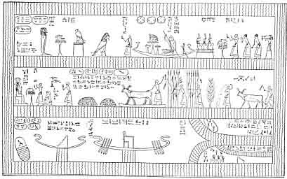 The Abode of Bliss (in Egyptian Sechnit aanru, also written aahlu), as depicted in the Turin papyrus of the Book of the Dead, shows us the departed one with his family, and Thoth, the scribe of the gods, behind them, in the act of sacrificing to three gods, the latter being decorated with the feather of truth. He then crosses the water. On the other side, he offers a perfuming pan to his soul which appears in the shape of a man-headed bird. There are also the three mummy-form gods of the horizon, with an altar of offerings before the hawk, symbolising Ra, "the master of heaven." In the middle part of the picture the departed one ploughs, sows, reaps, threshes, stores up the harvest, and celebrates a thanksgiving with offerings to the Nile. The lower part shows two barks, one for Ra Harmakhis, the other one for Unefru; and the three islands: the first is inhabited by Ra, the second is called the regenerating place of the gods, the third is the residence of Shu, Tefnut, and Seb.
