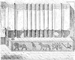 that we here give a description of it. One side of the bronze plate is entirely occupied by a four-footed monster, with four wings, standing on eagle's claws. Raising himself on his hind feet, be looks as though he intended to jump over the plate against which he leans. His head reaches over the border as over the top of a wall. The face of the wild and roaring monster towers, on the other side of the plate, above a picture which is divided into four horizontal strips representing the heavens, the earth, and hell. In the top strip one sees the symbolic representations of the celestial bodies. Underneath appears a series of seven persons clad in long robes and having beads of a lion, a dog, a bear, a ram, a horse, an eagle, and a serpent. These are the celestial genii called ighigs. The third strip exhibits a funeral scene, which undoubtedly happens on earth. Two personages dressed in the skin of a fish, after the fashion of the god Anu, are standing at the head and foot of a mummy. Further on there are two genii--one with a lion's head, the other with a jackal's head--who threaten one another with their daggers, and a man seems to flee from this scene of horror. The picture of the fourth strip is bathed in the floods of the ocean, which according to the traditional mythology of the Chaldeans reaches underneath the foundations of the earth. An ugly monster, half bestial, half human, with eagles' wings and claws, and a tail terminating in a snake's head, stands on the shore of the ocean, on which a boat is floating. This is the boat of the deity Elippu, frequently mentioned in the religious texts and probably the prototype of the boat of Charon in Greek mythology. In the boat is a horse which carries upon its back a gigantic lion-headed deity, holding in her hands two serpents; and two little lions jump to her breast to suck her milk. In the corner there are fragments of all kinds, human limbs, vases, and the remainders of a feast.