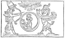 The struggle between Bell-Merodach and Tiamat was a favorite subject with Assyrian artists. In one of them,