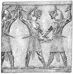 'At Kuyunjik, in the palace of Asurbanipal, we see in several corners a series of monsters with human bodies, lions' heads, and eagles' feet. They appear in groups of two, combating one another with daggers and clubs. They, too, are demons and express in the language of the sculptor the formula so frequently met with