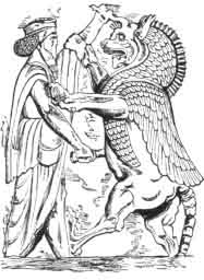 A representation of Ahriman has not yet been discovered among the Persian antiquities. There is, however, a bas-relief in Persepolis which depicts the king in the act of slaying a unicorn. The monster is very similar to the Assyrian Tiamat (see p. 41), and we cannot doubt that the Persian sculptor imitated the style of his Assyrian predecessors.
