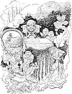 The goodwill that a poor wretch had shown in his former life to a spider, his only good deed, serves him in hell as a means of escape. (Reproduced from a colored Japanese illustration in Karma.)