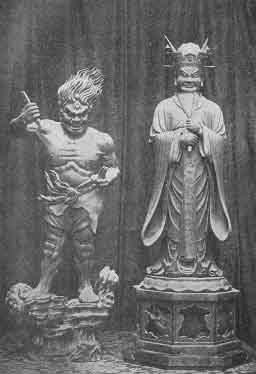 The folklore of Chinese Taoism and Japanese Shintoism was naturally embodied in the mythology of the Buddhists, and we find therefore in their temples innumerable representations of hell with all their traditional belongings; Emma, the stern judge of Meifu, the dark tribunal; Kongo, the sheriff, and all the terrible staff of bailiffs, torturers, and executioners, among whom the steer-headed Gozu and the horse-headed Mezu are never missing. By the side of the judge's desk stands the most perfect mirror imaginable, for it reflects the entire personality of every being. Since man's personality, according to the Buddhistic soul-conception, is constituted by the deeds done during life, the glass makes apparent all the words, thoughts, and actions of the delinquent who is led before it; whereupon he is dealt with according to his deserts. If good deeds prevail, he is rewarded by being