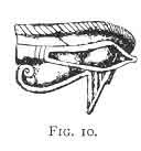 person) whose form the beetle was made to represent, would never bear witness against the dead in the day of judgment. The commonest of all Egyptian amulets, except the scarab, was that known to English people as the Eye of Osiris: "L'il mystique (Fig. 10), l'ouza lie au poignet ou