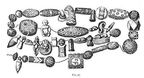 In the remarkable necklace or string of amulets found in a tomb at Kertch, taken by Jahn from the Russian work of Achik, 222 a great many of the separate objects have markings on them which can only be intended for eyes (Fig. 21).