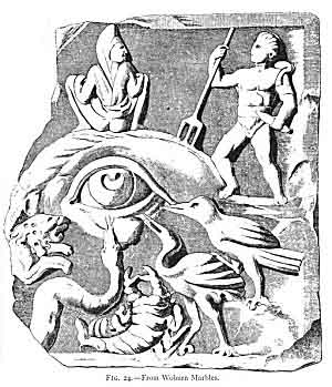 Perhaps the most noteworthy of all the amulets in which the eye forms the central object in combination with several other emblems, is the very remarkable relief illustrated in Millingen's paper in vol. xix. of Archæologia, p. 74, and referred to by Jahn. 225 It is one of the Woburn marbles (Fig. 24) in the collection of the Duke of Bedford, and measures 1'6" x 1'5", but this last dimension is not perfect, being broken on the left side. There was a framing, and it is usually thought to have been built into a wall, as a house-decoration, but still more as a protection. The centre is a large human eye, and, as Jahn says, "the left, which may be considered a special feature of its sinister intention, and moreover the pupil is strongly marked." 226 Over it is a very prominent eyelid and an arched brow. Above this is seated a beardless man in a Phrygian cap, with his back towards the spectator, and his head turned backwards. He is squatted down with both hands on his knees, has his shirt pulled up, and strikingly exemplifies the description of Pomponius:--