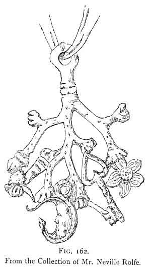 The key, which like the crescent takes a prominent position, appears in every perfect specimen. We may therefore conclude that it is an important amulet; this key also is compounded. On the Cimaruta the bow of the key is always shaped like a heart as on Fig. 162. In Fig. 112 the key appears singly, i.e. without the heart, in many shapes more or less ornamental, clearly proving the position it holds in Neapolitan estimation as a simple charm to be worn by adults, as well as in its compounded form by infants. As an amulet it has a distinct phallic significance. 582