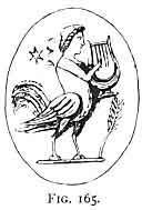 The cock on several gems, like Fig. 14, is either alone or combined with Apollo in a grillo, as in Fig. 165. 585a He is regarded as a "solar animal," 586 and thus sacred to the sun-gods, Osiris, Serapis, Jupiter, Apollo. The cock is also the symbol of Mercury, denoting vigilance. He: is sometimes represented as holding an ear of corn in his bill, meaning that "only vigilance can produce plenty." 587 As a watchful