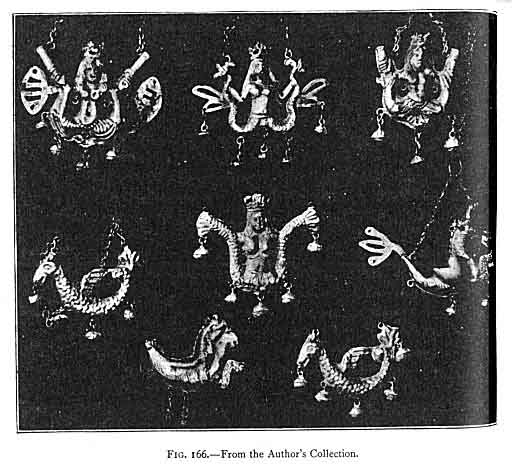The cavalli marini (Figs. 166-169) of course represent the same sea-horses as those upon the Diana statues. The sea-horse is an amulet apart, worn equally by the cab horses and upon the breasts of Neapolitan women. On the statues these creatures seem to have heads more like goats than horses. The same may be said of the silver charms. Nevertheless they are all known as cavalli.