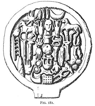 [paragraph continues] It is of course possible that bronze also may have been cast in these moulds, for the many specimens of the Mano Pantea are all cast in a mould of some sort, and the symbols upon them have been dressed and trimmed afterwards, just as the statuettes of bronze or of terra cotta have been finished up after being cast. These things could no more have been used for sacred cakes than the other moulds exhibited alongside them at Oxford-from which ornamental plaques, statuettes, and other artistic objects have been made.