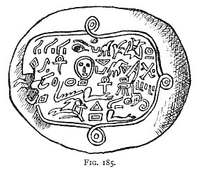 Somewhat allied to the remarkable terra-cotta plates we have been discussing is the curious tablet illustrated in Pignorius, 608 of which Fig. 185 is a copy. Many of the objects drawn upon it are very obscure, yet amongst them are some we recognise as old acquaintances; and there can be little doubt of the whole being a protective amulet against the evil eye, and that it is a veritable Mensa Isiaca. The head probably represents a skull, or possibly it may be the same person as the bust in Fig. 181. Over it is the mystic eye. The triangle, whether with base or apex downward, is a well-