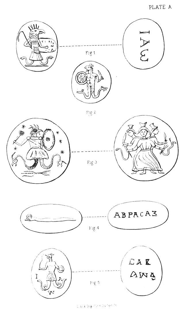 3. Abraxas, wielding a mace, a Persian weapon that betrays the Asiatic origin of this particular design; the thunderbolt in the field identifies this Power with the classic Jupiter. The reverse exhibits the Triple Hecate, Queen of Hell, brandishing various weapons for the same prophylactic purpose as the god himself. A unique combination of ideas, engraved upon a circular copper plaque, found in the south of France.