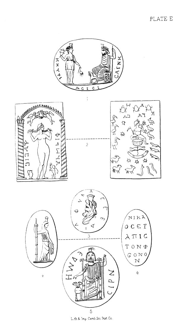 1. Serapis, viewed as the Sun-god, enthroned; at his feet, the triple-headed monster described by Macrobius. Before him stands Isis, or Mother Earth, holding a bunch of wheat-ears and poppy-heads, to mark her character. The legend is the invocation "Immaculate is Our Lady, Isis!" A fine specimen of Alexandrian art, in a beautiful sard. (New York.)