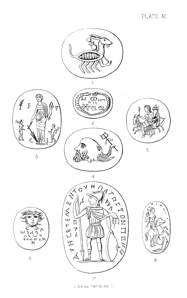 6. The Gorgon's Head: the type explains itself by the legend, "I protect Rhoromandares"--some Greco-Persian, to judge from his Oriental name. The younger Lucian tells us in his 'Philopatries' that the Gorgon was placed upon the shields of the Heroes as being "a thing that wards off all dangers." Red jasper. (New York.)