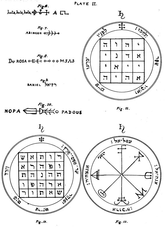 the most perfect existing form of double acrostic, as far as the arrangement of the letters is concerned; it is repeatedly mentioned in the records of mediæval Magic; and, save to very few, its derivation from the present Pentacle has been unknown. It will be seen at a glance that it is a square of five, giving twenty-five letters, which, added to the unity, gives twenty six, the numerical value of IHVH. The Hebrew versicle surrounding it is taken from Psalm lxxii. 8, 'His dominion shall be also from the one sea to the other, and from the flood unto the world's end.' This passage consists also of exactly twenty-five letters, and its total numerical value (considering the final letters with increased numbers), added to that of the Name Elohim, is exactly equal to the total numerical value of the twenty-five letters in the Square.