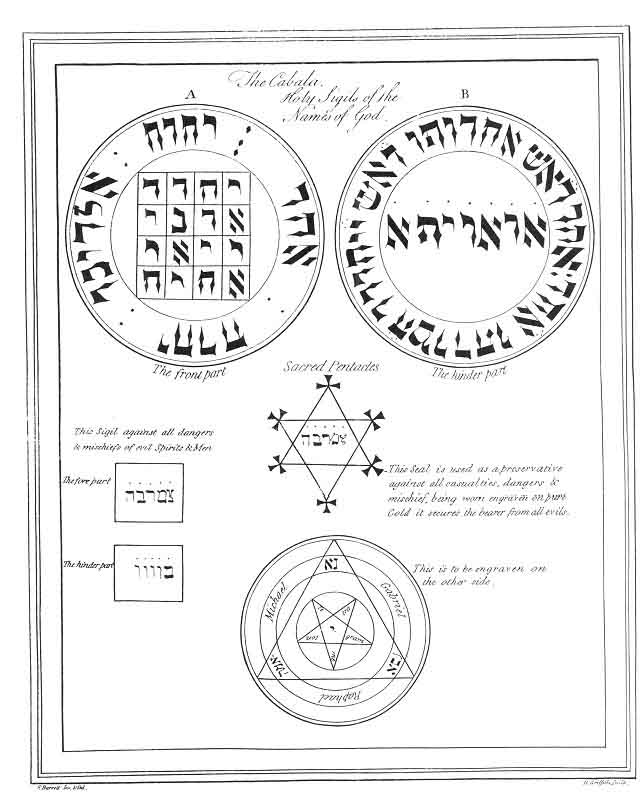 Now, against the depredations of evil spirits and men, and what dangers soever, either of journies, waters, enemies, arms, &c. in the same manner as is above said, these characters on the one side כיייי, and these on the other צפכה, which are the beginnings and ends of the five first verses of Genesis, and representation of the creation of the world; and, by this ligature, they say that a man shall be free from all mischiefs, if that he firmly believes in God, the Creator of all things.