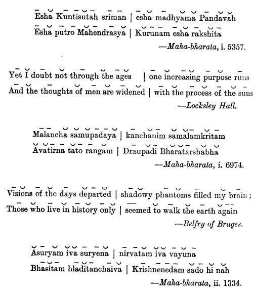 I have recited a verse in this English metre and a Sloka in presence of listeners who have a better ear for music than myself, and they have marked the close resemblance. I quote a few lines from the Sanscrit showing varieties of the Sloka metre, and comparing them with the scheme of the English metre selected.